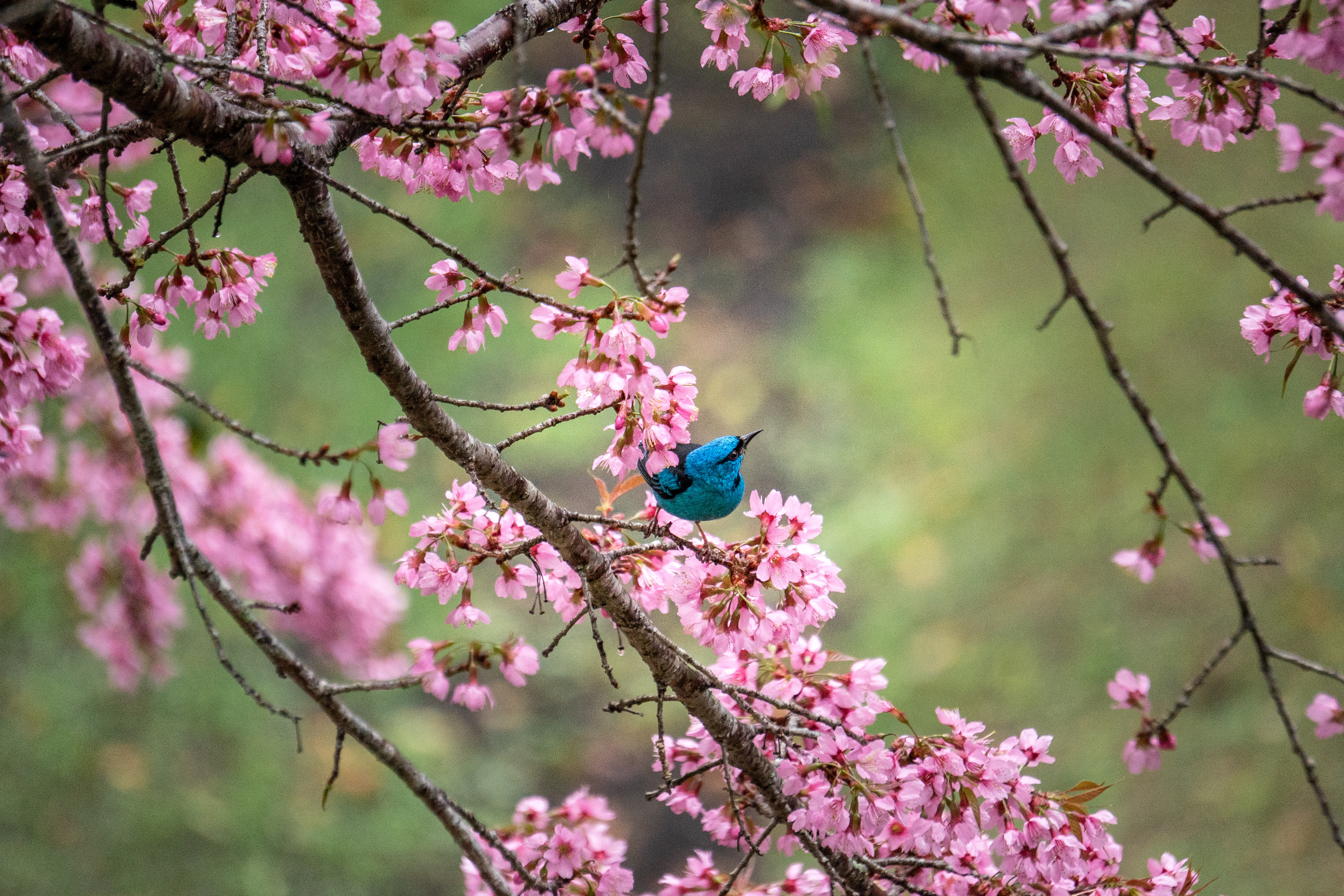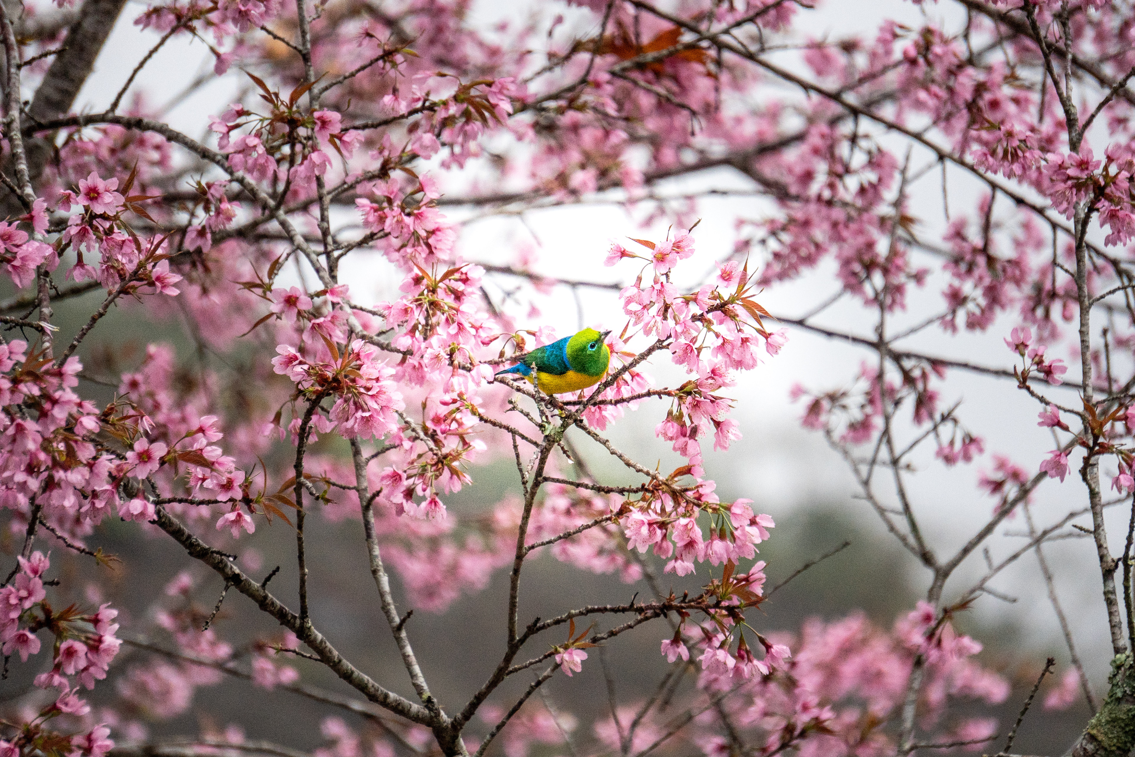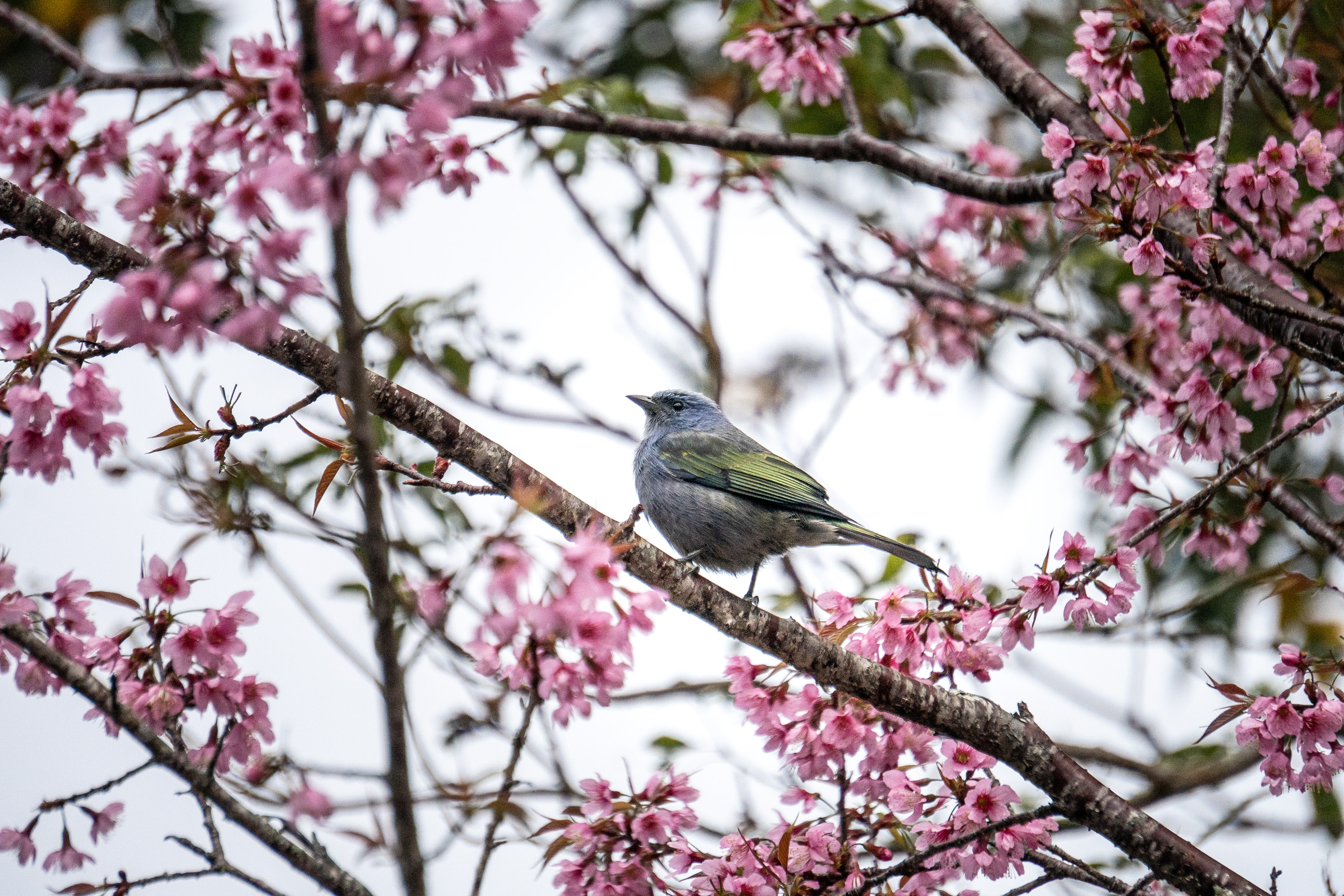On a cold and beautiful afternoon, with light rain and clouds covering the mountains of Espírito Santo, we went out as a family for a walk. We stopped at a restaurant surrounded by greenery, facing Pedra Azul (hidden by the mist), and there we found a cherry tree filled with soft pink blossoms, standing among other trees.