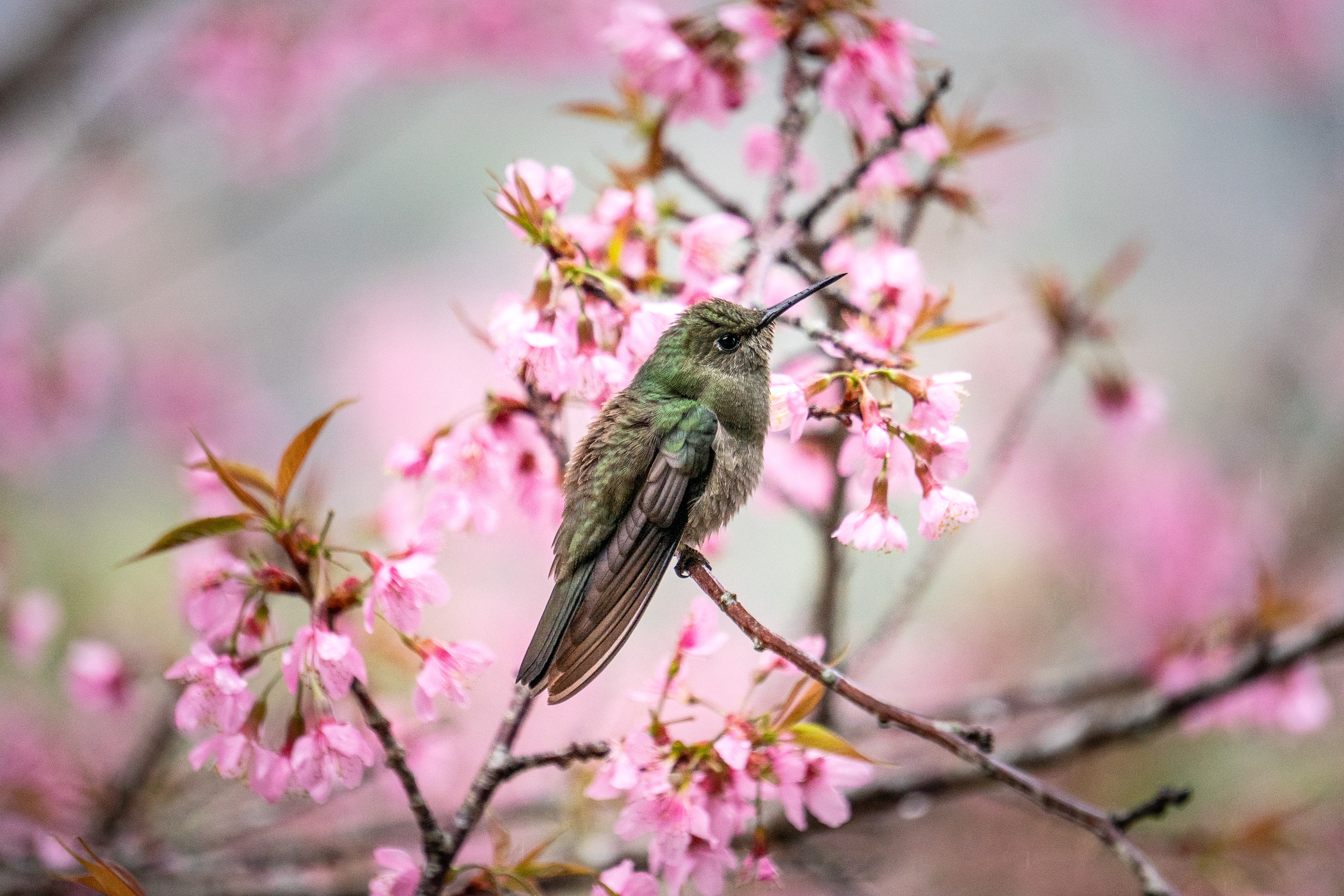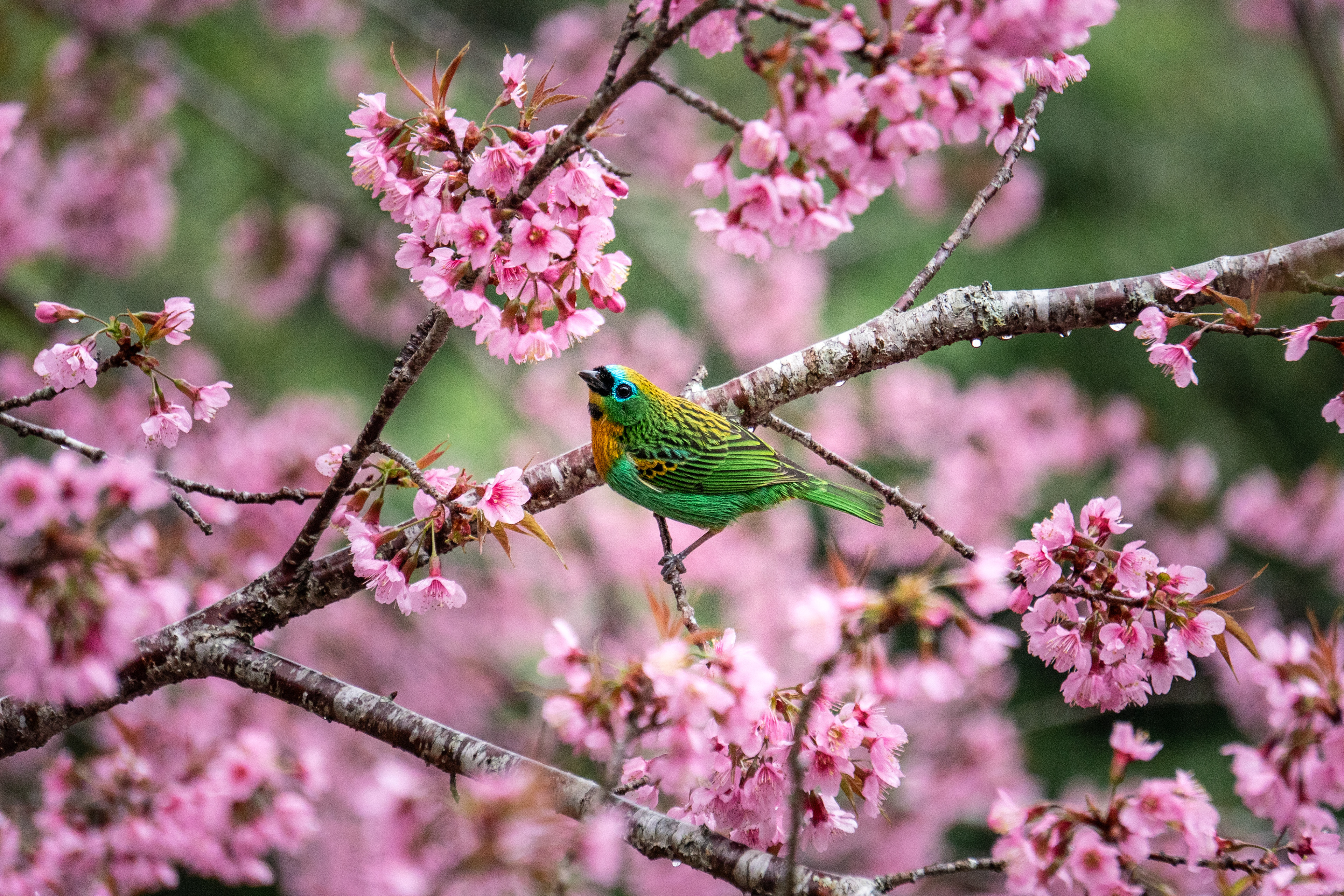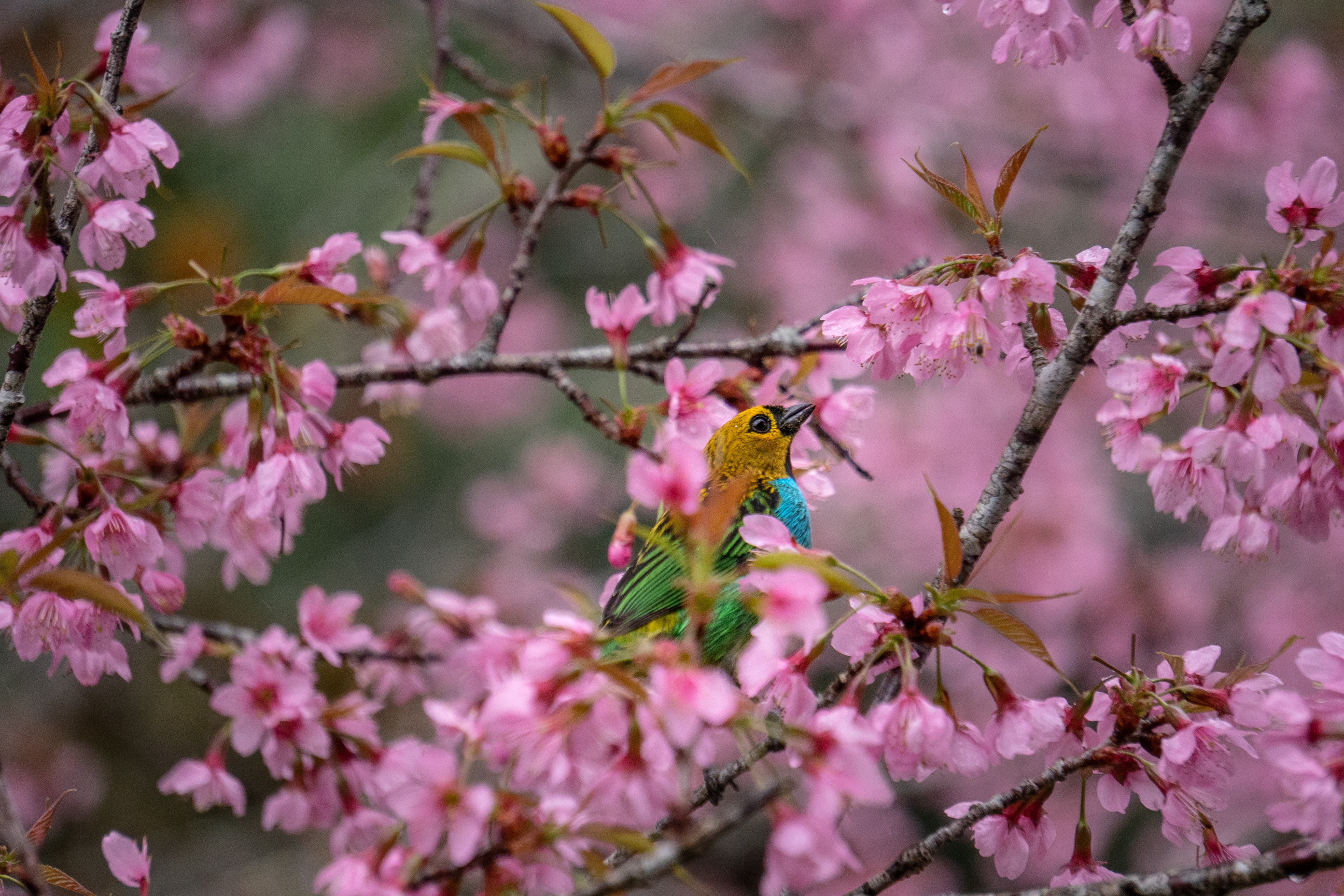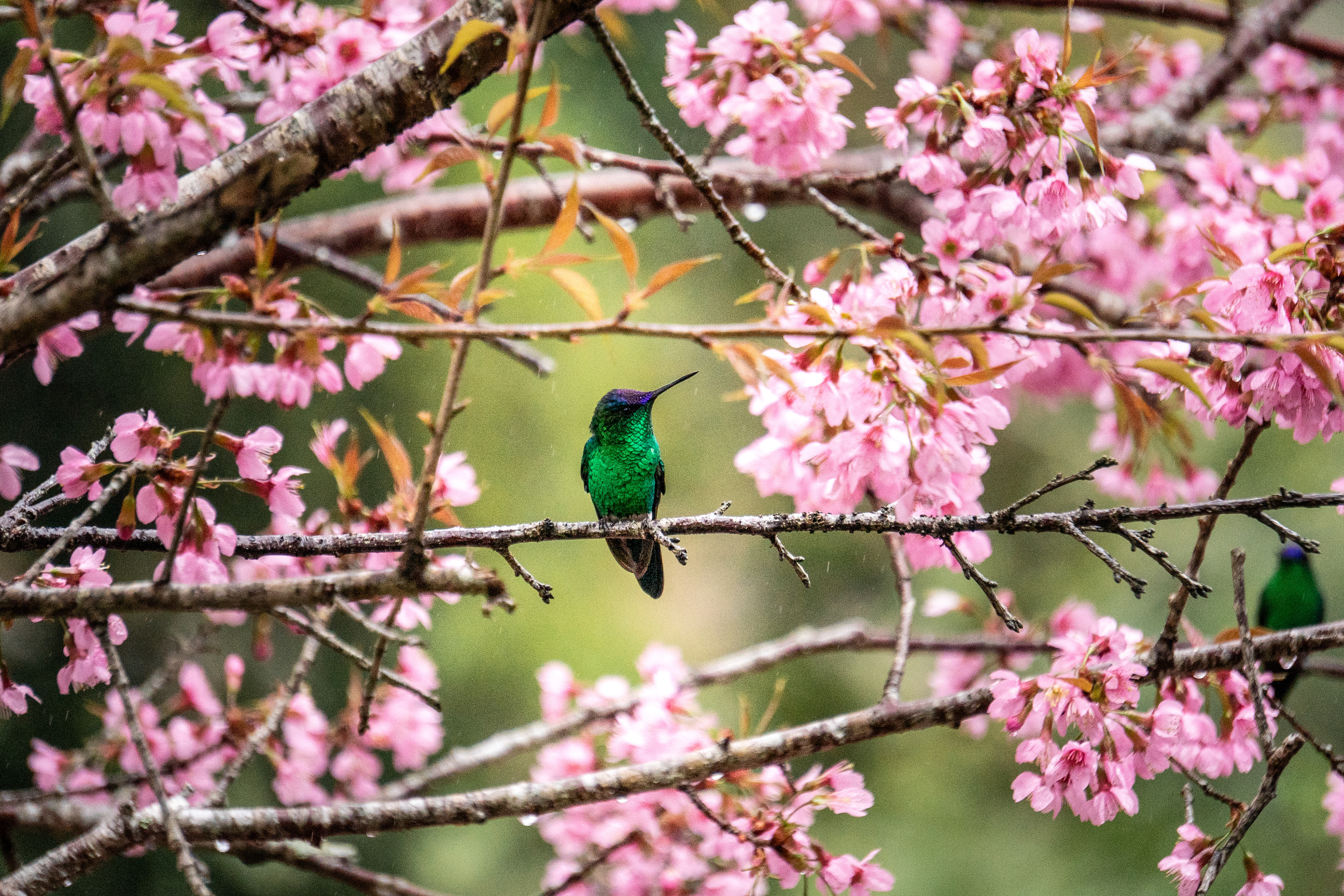 On a cold and beautiful afternoon, with light rain and clouds covering the mountains of Espírito Santo, we went out as a family for a walk. We stopped at a restaurant surrounded by greenery, facing Pedra Azul (hidden by the mist), and there we found a cherry tree filled with soft pink blossoms, standing among other trees.